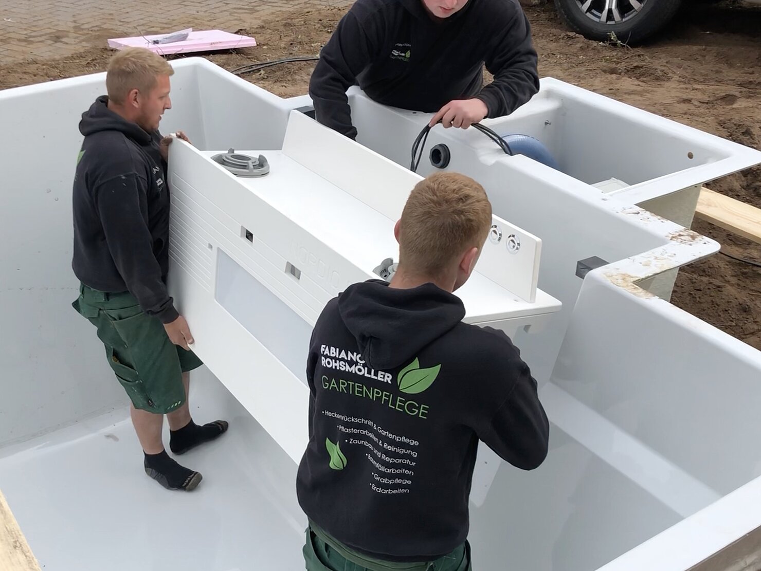 Après avoir fixé le boîtier technique à la piscine, vous accrochez la carte électronique à l’intérieur. Ensuite, la NORDIQ TT est suspendue dans la piscine. Les câbles et les tuyaux des boutons-poussoirs, déjà préconnectés, sont passés à travers le passage prévu. Enfin, la partie technique est raccordée et mise en service par un électricien.